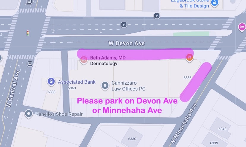 - There is a stretch of free 1 hour parking spots on Minnehaha Avenue just south of Devon, about 1 block east of Dr. Adams’ office.